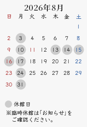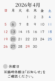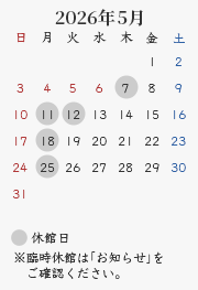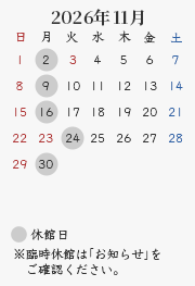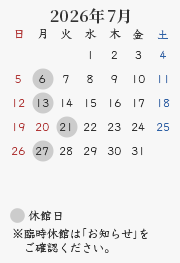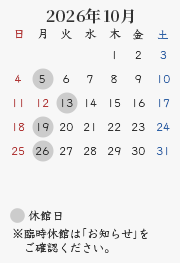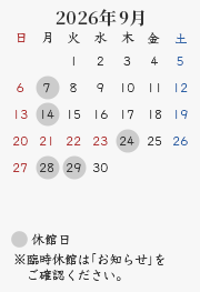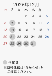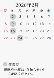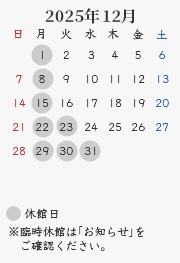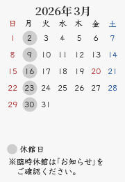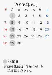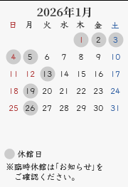 休館日:毎週月曜日(祝・休日の場合開館、翌平日休館)、年末年始・夏期・臨時休館(カレンダーをご確認ください)